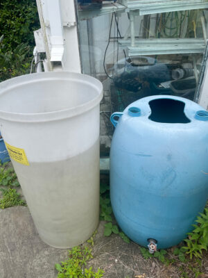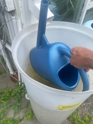 With all the rain we’ve had this summer, I decided it was time to build a rain garden to absorb some of the water runoff from my greenhouse roof. Because the greenhouse is a lean-to-style one attached to my studio building, additional water runs off the studio roof as well. This runoff can fill my two 50-gallon (190-liter) barrels in minutes in a strong thunderstorm. A hundred gallons of runoff collected can water the plants in my greenhouse for up to a week. But when we have a day-long rain instead of a passing thunderstorm, a large amount of water gets wasted as it overflows the barrels and soaks the surrounding lawn. Rather than have a soggy lawn, I’ve decided to build a rain garden.