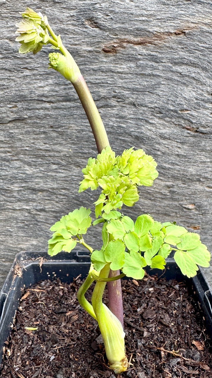 Some of my plants – notably the Thalictrums – had begun to sprout while in transit from the Netherlands, producing pale yellow, light-starved, topsy-turvy shoots, but it was nothing to fret about. A few days in the shade after potting and they’ve coloured up, and the wonky shoots are righting themselves.