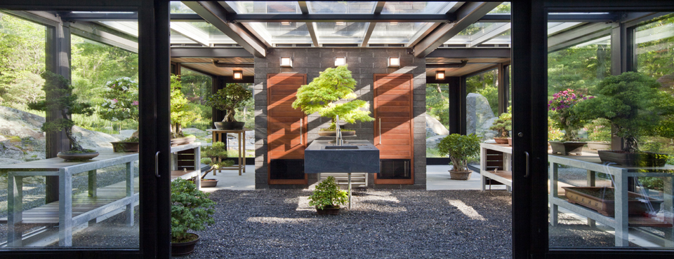 Phillip Johnson’s “Glasshouse” in New Haven, Connecticut, is one of the icons of mid-century modern architecture. Steel-framed and glass-walled (hence its popular name) it seamlessly blends indoors and outdoors. It’s sophisticated simplicity has been the pattern for much early-21st century design. The photograph below, from my book, The Midcentury Modern Landscape, shows a Johnson-inspired modernist “cabin” in the woods, which provides a quiet domestic sanctuary for the homeowners and shelter for their cherished bonsai, miniature trees that have been carefully designed to recreate in miniature the landscapes from which they come.
