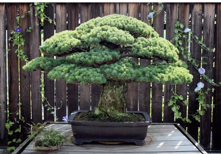 Bonsai originated in China, making its way, some 800 years ago, to Japan along with a form of Chinese Buddhism that, stripped of its elaborate rites, became Zen Buddhism. Contemplative Zen monks abandoned the Chinese notions of the sacred and mystical properties associated with these small, tutored trees grown in even smaller pots, and instead saw in their carefully designed nano-landscapes a representation of the universe. Within a few hundred years, bonsai were being grown by everyone, and in the late 1700s, an annual show of miniature pine trees was begun in Kyoto.