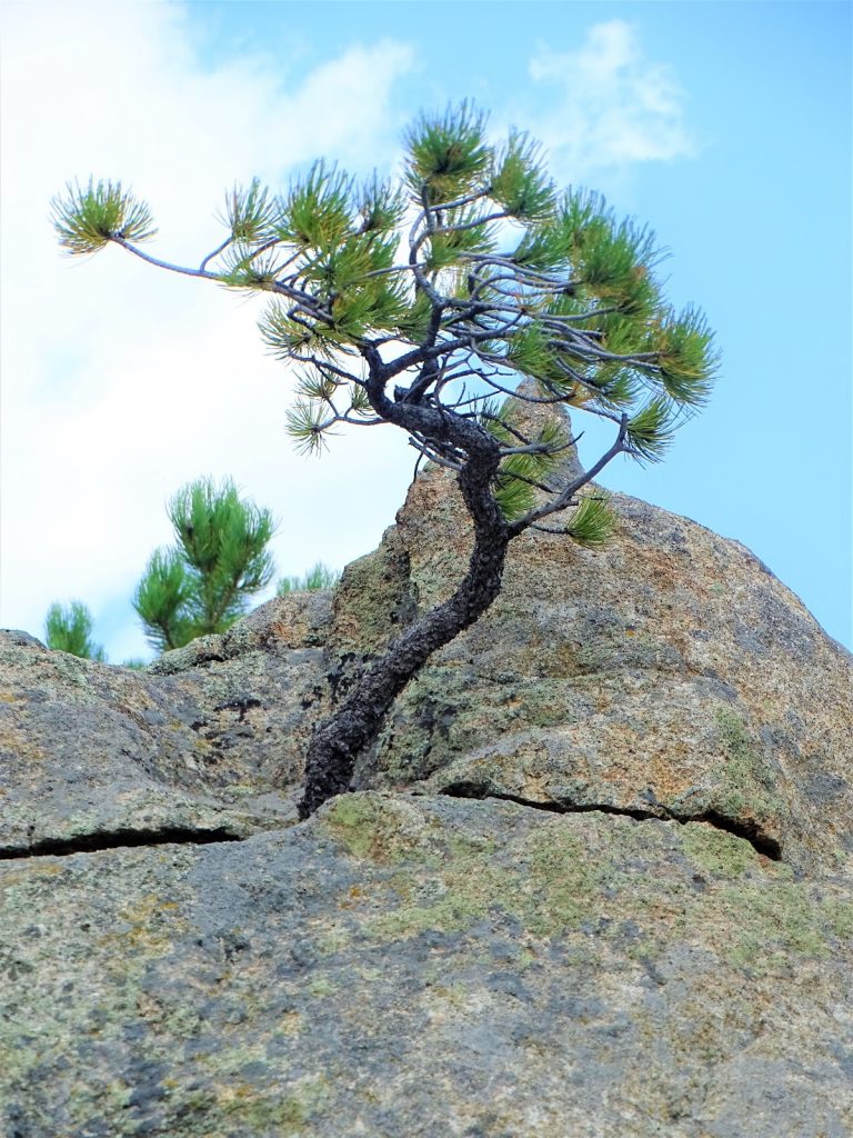 Bonsai require attention and devotion to thrive, but an artistic eye and an ability to envision idealistic landscapes in miniature are absolutely necessary. There are special tools and techniques and numerous books on the subject to guide the beginner, one of the best being Ponderosa Pines as Bonsai by Larry Jackel, who is Curator of the bonsai collection at Denver Botanic Garden. It seems that Ponderosa pines are exceptionally well-suited to bonsai training, and on my gentle strolls through the less challenging trails around my house in Colorado Springs, I have seen seedling pines sprouting among the rocks and thought to myself, “If I was wanting to create a bonsai… .”