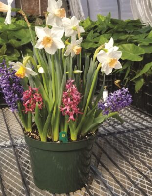 Tip #3—Consider more light, less heat. Either way, when you shift them from the cold, it takes four to five weeks until bloom time. The flowers will last longest in a cool (50-60 degrees) greenhouse with strong light. If your lighting conditions are not bright, Brent recommends LED lights placed a foot above the emerging foliage to keep stems short and sturdy. Bring the blooming containers into your warmer home to use as décor and then replace them in the cooler greenhouse to extend their winter beauty.