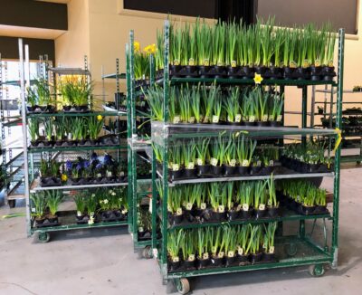 Tip #2—Plan your timing. “With spring bulbs, the earlier they bloom naturally, the shorter the period of vernalization,” Brent says. For the best success, he advises, “Stick to early bloomers.” On average, bulbs vernalize in ten to sixteen weeks, with ones like crocus and Leucojum at the shorter end and tulips at the longest. Brent suggests setting a calendar notice, so you don’t forget to take them out of the cold. Or you can by-pass vernalization altogether by ordering pre-cooled bulbs. When you receive them, pot them up in the same well-draining planting mix you would use for any bulbs, but these you can place on a greenhouse bench immediately.