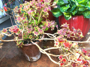 Within a few weeks, check the bag. Add some water if dry—not likely—and pull a cutting to check the roots. If looking moldy, leave the bag open to the air. For sure there are functioning roots when a new leaf appears on top. Then transfer the cuttings into individual four-inch pots to continue to grow. Keep the soil moist but not soaking. As they get bigger, allow them to dry out a bit between waterings. Then you have a collection of plants to add to spring containers or borders and enjoy all summer.