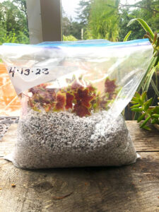 Zip and place on a greenhouse bench or a windowsill with morning light. The upper leaves should remain turgid. If they wilt, well, that wasn’t the right method for those plants. Dump out, wash the perlite, and try again with different plants.