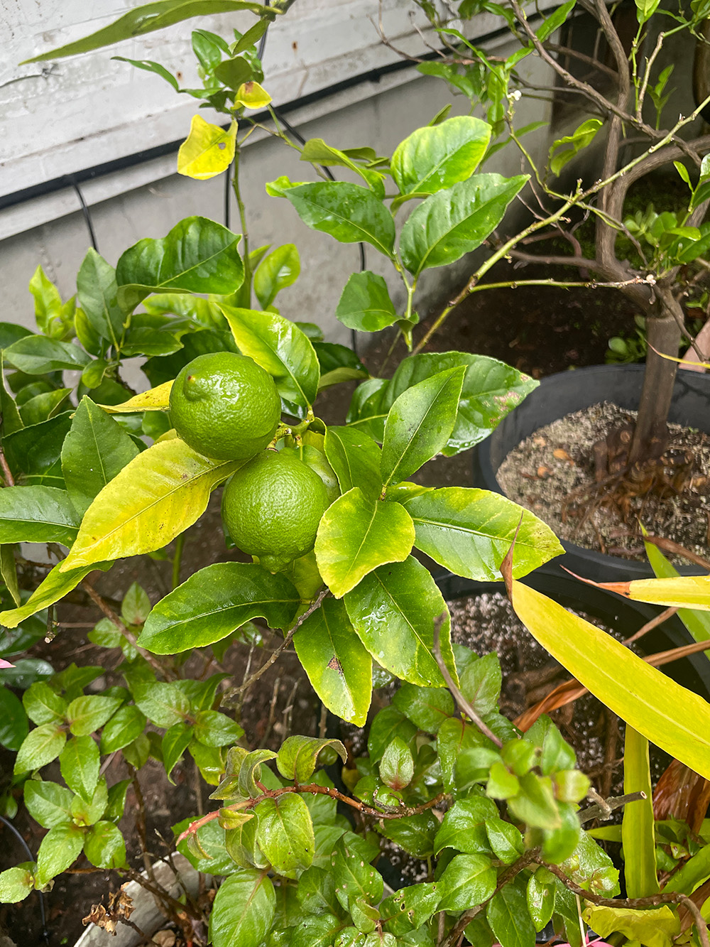 I also grow fruit trees in the heated greenhouse. One is an orange tree that has already produced fruit for this year. Another is a 25-year-old, seven-foot-tall key lime tree that’s currently in full bloom. On warm days, I leave the greenhouse door open so that insects can enter and pollinate the flowers. My citrus crops will continue growing in the heated greenhouse until they’re ready to be picked, usually from late January into February. I lightly fertilize the trees as soon as they flower until the fruit is picked.