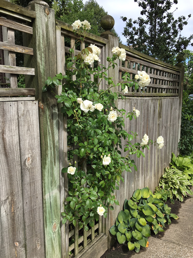 I’m also training climbing roses. Roses are naturally shrubs, not vines, with no natural climbing ability. The rose varieties we call “climbers” or “ramblers” are simply shrub varieties selected for having unusually long, straight canes. To make roses cover a wall, arbor or trellis, you need to guide the stems against a support and tie them to keep them there.