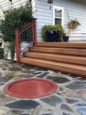 I started on my own powder-coating journey of discovery when I needed to save a custom-made steel cover that sits over my septic tank lid. It had rusted badly. The cost of remaking the plate was prohibitive. Someone suggested powder coating it. So, I hauled my cover in the back of my SUV to a local shop, Karam Coatings. The folks were so helpful. The round metal plate came out great. It sits on a small rock patio—aren’t all septic tanks right where you don’t want them? Instead of trying to make it blend in, I chose a color that stands out, as if it were purposeful décor.