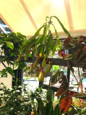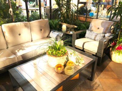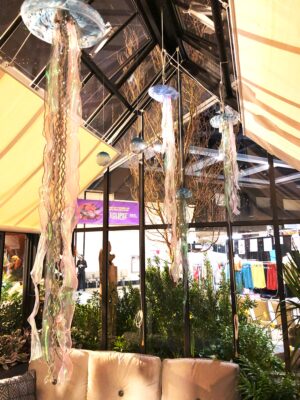 The sun shades were partially drawn up the angled glass roof, and tropical plants festooned the shelves and potting tables. Comfortable couches invited you to sit and look around. Blown glass jellyfish lights hung down from the ceiling, their glistening plastic tentacles moving in the slightest breeze. It was a space where you wanted to linger. And many did.