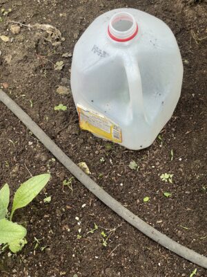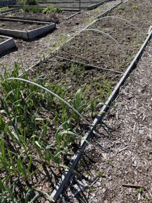 I also looked for solutions in different styles of cloche. One of the easiest styles to make is done by bending 5/8-inch (15 mm) plastic water pipes at intervals over my 4 foot (1.3 m) wide raised beds and then covering the pipes with plastic sheeting to form a hoop-shaped enclosure. However, this idea has drawbacks too. Watering the plants can be inconvenient, and the temperature inside the enclosure can reach 90°F (32°C) on sunny spring days, causing the plants to transpire more quickly and wilt. Eventually, I resorted to covering the pipes with plastic sheeting only if overnight frost was forecast.