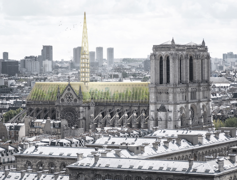 So Studio NAB, in their self-described “altruistic” proposal, offers an image of a greenhouse in the sky, a conservatory cum cloister that follows the original outlines of the now-vanished ancient roof, but which uses reclaimed wood from its beams to create raised beds, planters, and benches. Gold-colored metal frames hold the glass panels like a jeweled crown, and at the place where the steeple once stood, a new one takes its place, but replacing the bells with an apiary for Notre Dame’s renowned beehives, giving a new home to the bee colony that occupied the tower but managed to escape the flames. This one feature appeals most pertinently to the Prime Minister’s wish for a design that speaks to the issues of our times. In French, the word flèche or arrow, is used to describe a steeple that is erected above the crossing point of nave and transept. Maybe it is too fanciful to think of an apiary flèche as pointing the way to an enduring future.