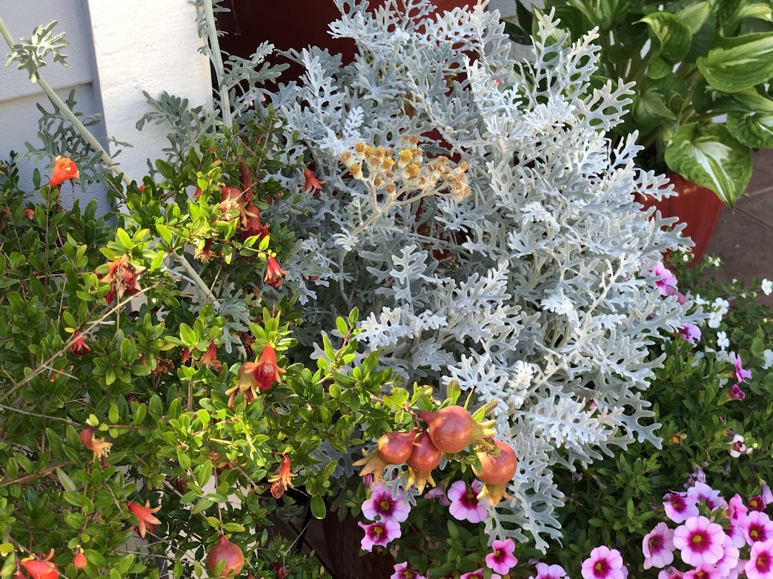 Centaurea cineraria – Also known as Jacobea maritima, with the common name dusty miller, this two-foot by one-foot lacy-leaf plant is grown as an annual in any Zones below 8. But it is easy to propagate in the greenhouse from cuttings. In fact, like a coleus, cuttings will root in water, so you can have sweeps of silver in your garden beds and containers next year.