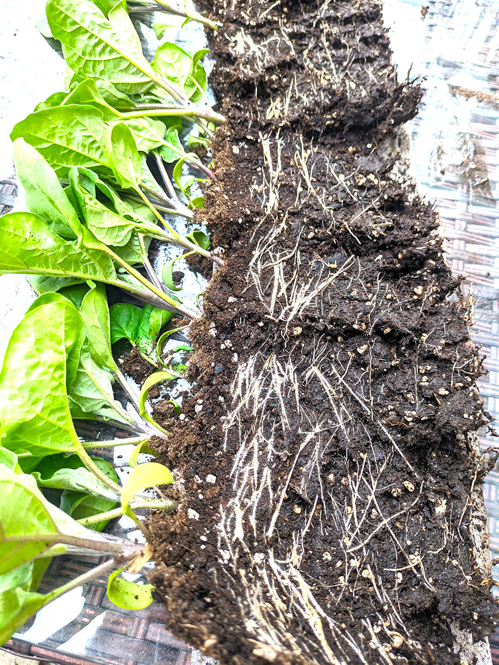 No potting up, just re-roll. If growth slows dramatically, or plants start to have yellowing leaves, or if the weather’s not warm enough to send them outside, clip the tape and unroll on a flat surface. Add another layer of potting mix right over the developing roots. Then re-roll and tape again. Remember that couple of inches left clear on the wrapper end? That will accommodate the extra mix when the roll becomes fatter.