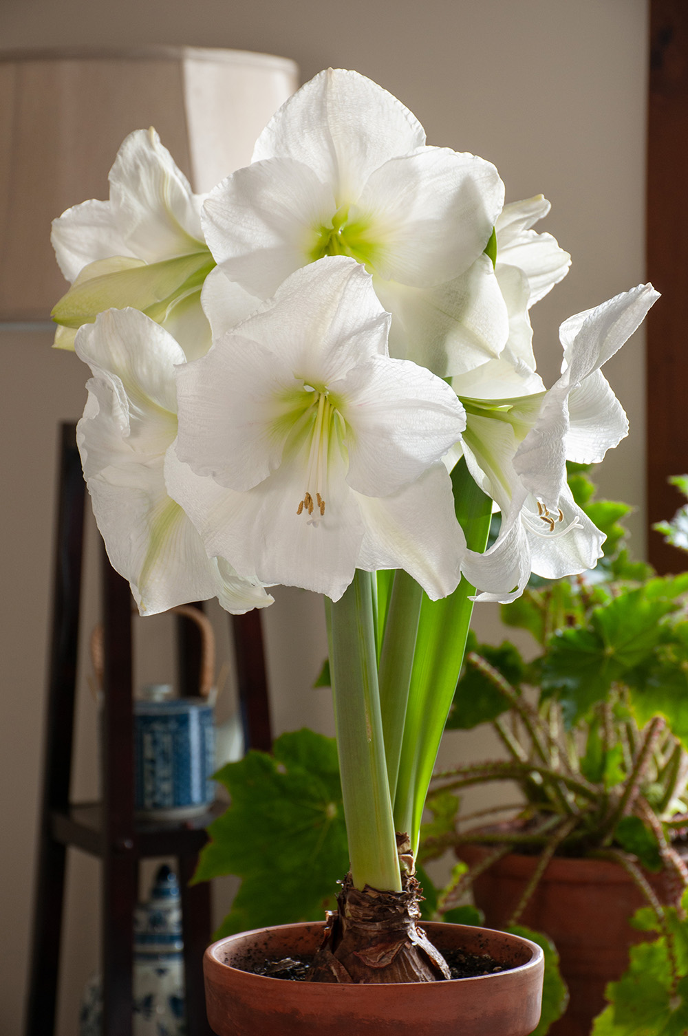 After flowering, many folks will discard an Amaryllis, but it’s easy to bring them along through summer to rebloom again in winter. After all frost is past, you can harden the bulbs in their pots outdoors in a shaded location, gradually bringing them out to full sun in the north, and half-day in the south. The large strappy leaves are a great design element on a patio or planted in the garden. If the original pot seems tippy because of leaf growth, you can repot to a larger container—up to fourteen inches in diameter—the fleshy roots will have plenty of room to grow.