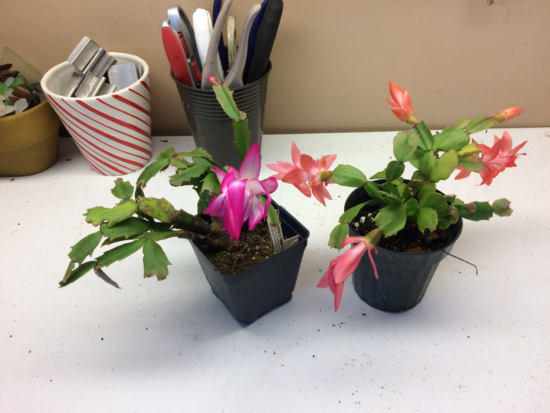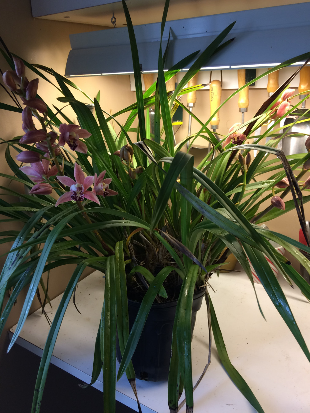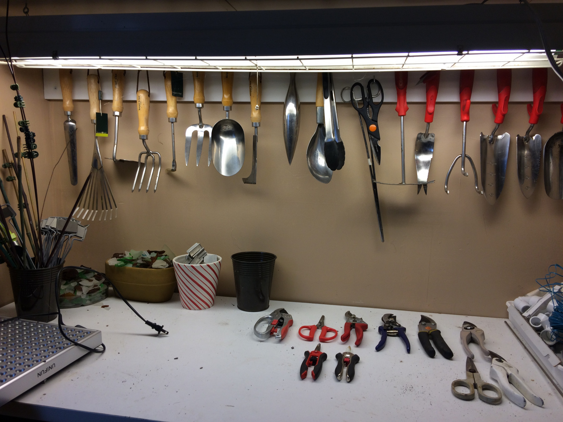A potting shed doesn’t need to be large, just carefully organized. My potting shed is only 8’ x 4’, but it holds everything I need to work in my greenhouse efficiently. The trick is using the space well. In my potting shed, a wide shelf across one end, with a fluorescent light above it, gives me a comfortable workbench. My hand tools are hung along the wall at the back of this bench, and above the bench are cupboards containing supplies packaged in relatively small-sized bags, boxes, and bottles. Below the workbench, I put pots and potting soil, as well as heaters not used in summer. On one side there’s a mini fridge to store bulbs and seeds to be forced into bloom during winter. To use every bit of available space, the back of the door has a rack for hanging larger tools, and a shelf over the window holds items infrequently used.
