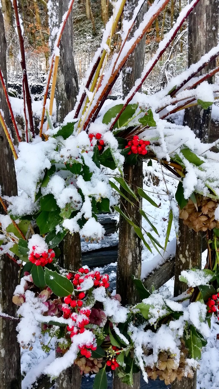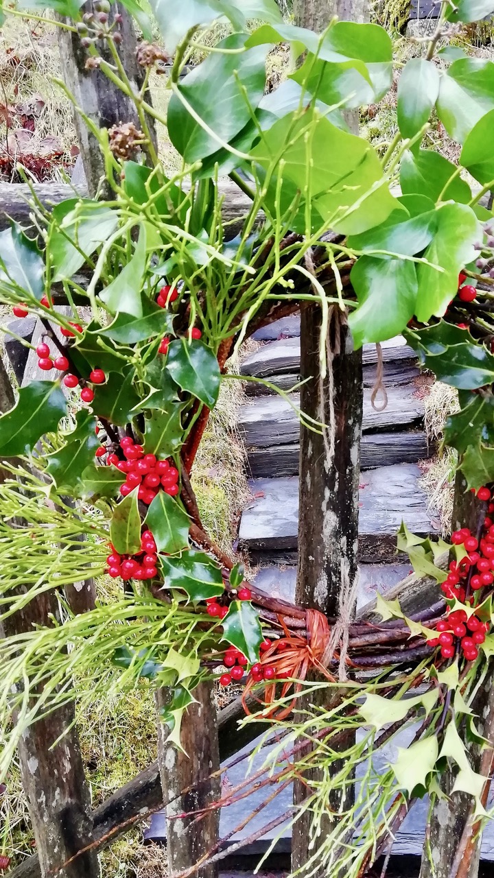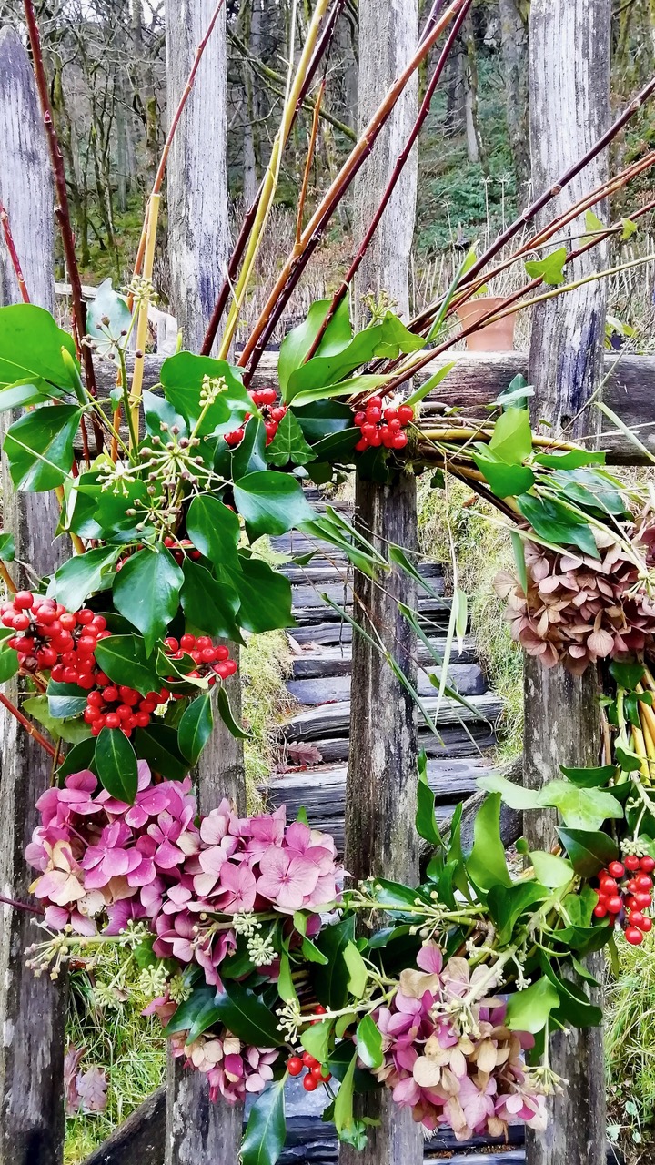 Holly, ivy and still-fading hydrangeas make interesting decorations.