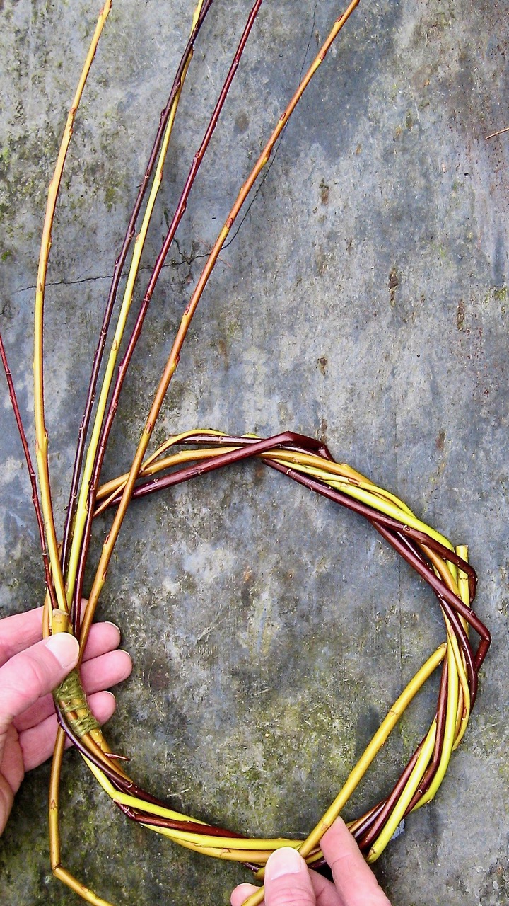 I weave each willow stem up and over, corkscrew-like, clockwise, around the circle.
