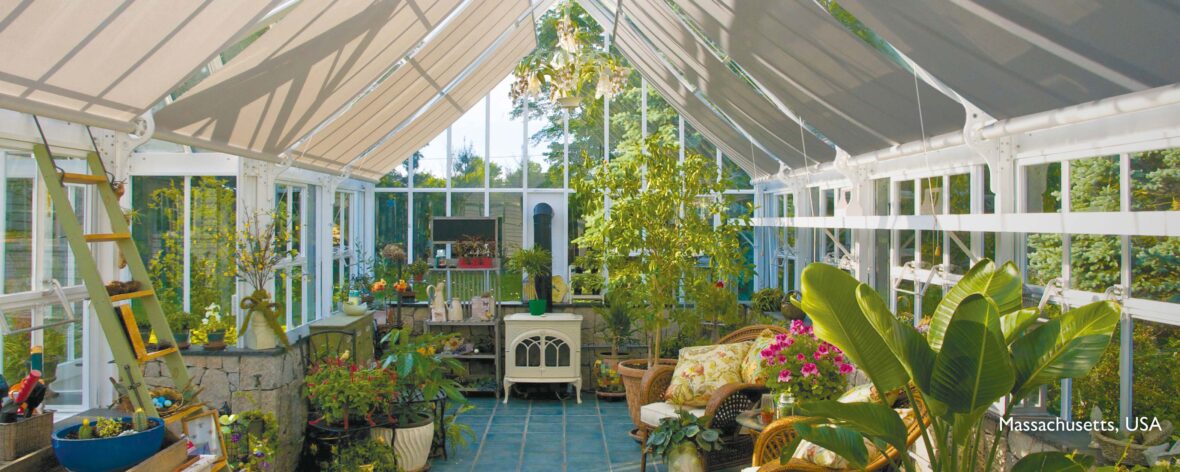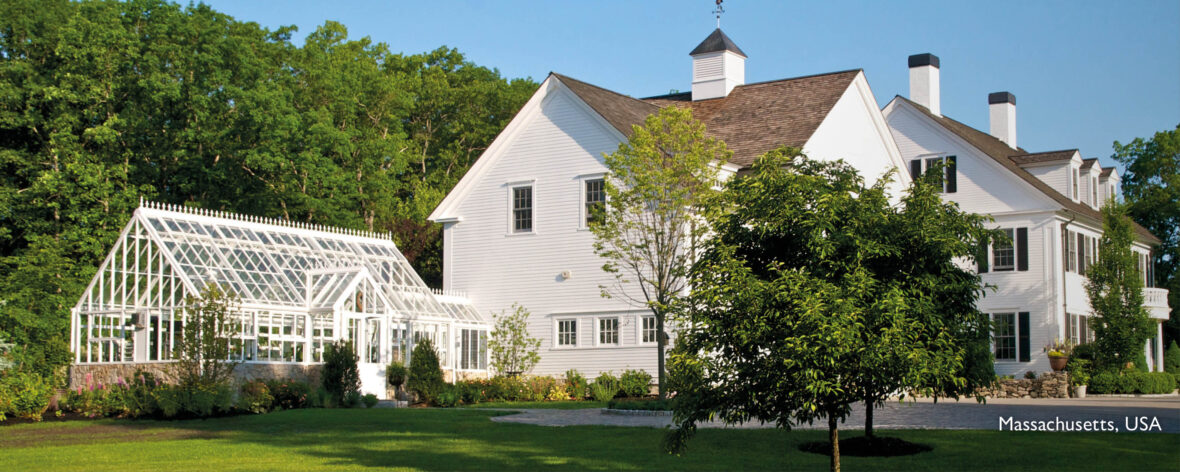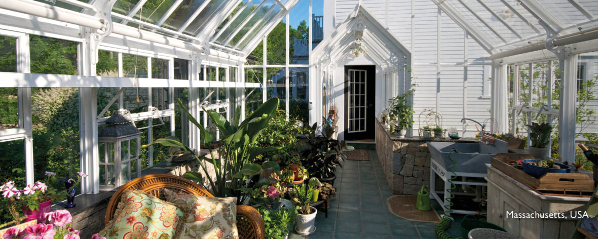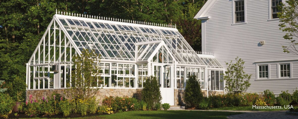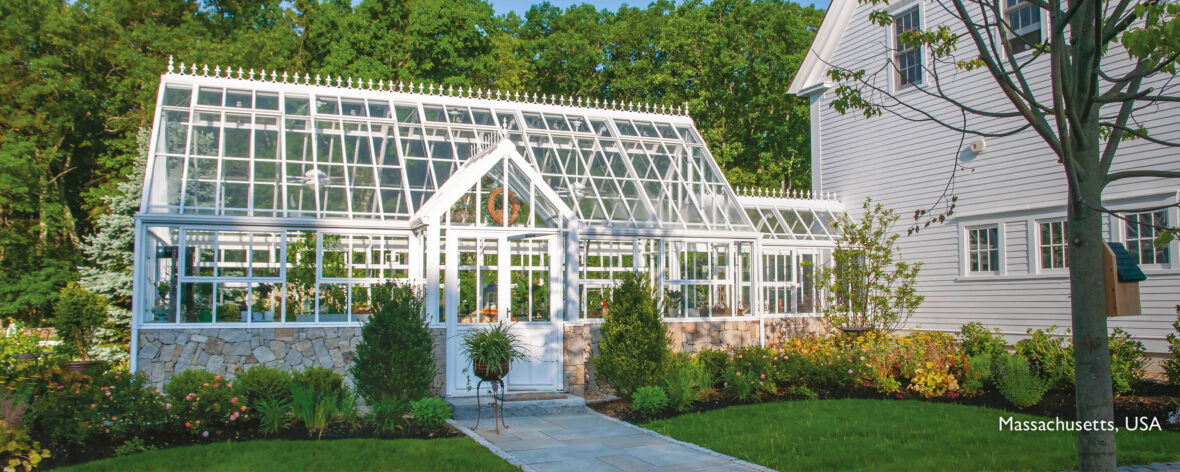 New England’s unique architecture, designed centuries ago for hearty farmers to survive winter, gives our customer a stepping off point for this linked greenhouse. The white Greek Revival barn has a glass link to the white Victorian Manor greenhouse in which a wood stove and chairs give the owners a cozy place to sit and dream all year round and a place to protect tropical plants during long New England winters.